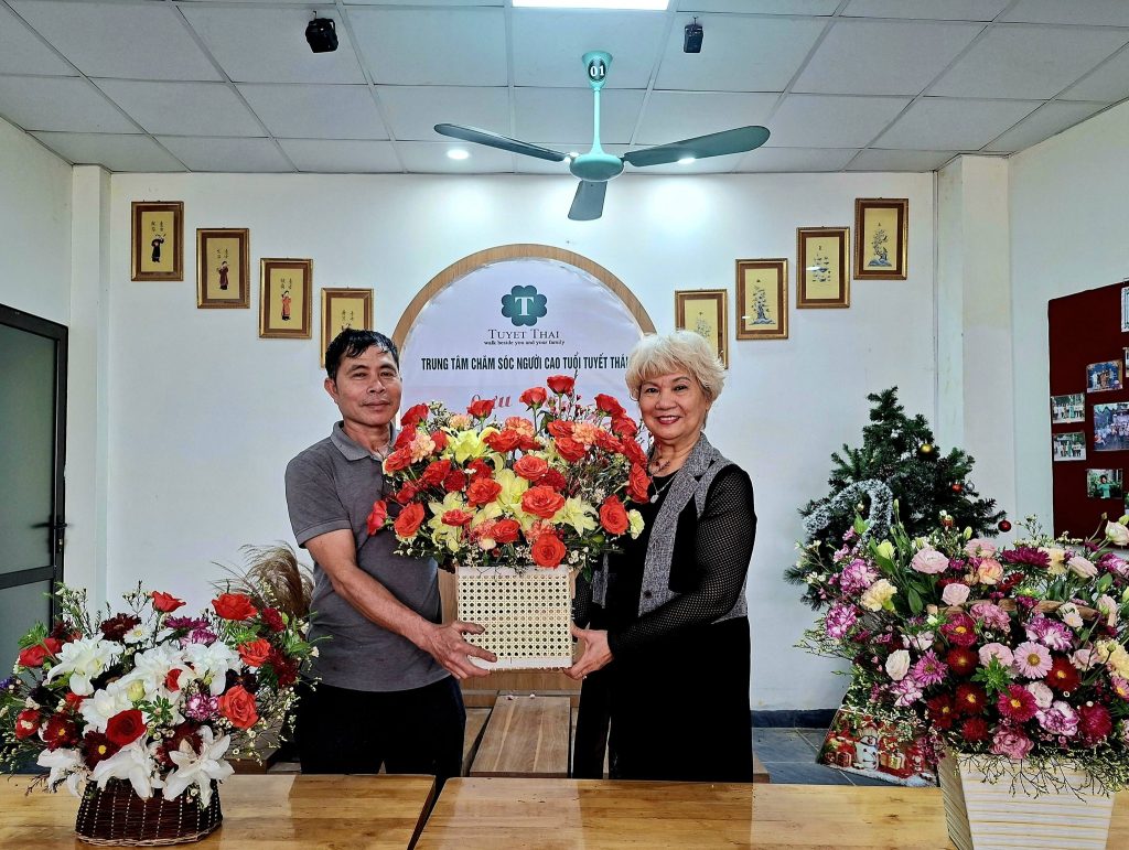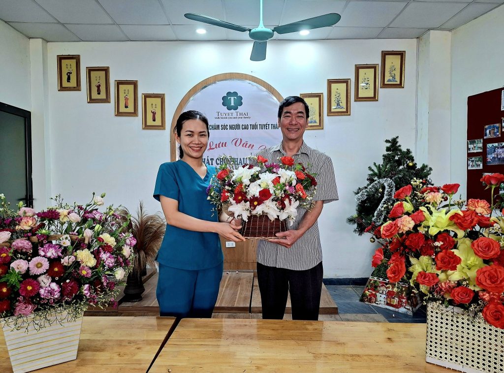 Anh Nhâm Hồng Hải – Giám đốc Trung tâm Chăm sóc Người cao tuổi Tuyết Thái; Phó Giám đốc Trung tâm Vì Ngày Mai, đại diện các nam giới của Trung tâm đã dành tặng những bông hoa tươi thắm cùng những lời chúc tốt đẹp nhất tới Tổng Giám đốc Nguyễn Thị Bạch Tuyết và đội ngũ nữ Cán bộ nhân viên, điều dưỡng.